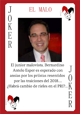 El joker malo de la semana fue para el aferrado y quemado malovista, Gerardo Vargas Landeros que corre el riesgo de quedarse como "el perro de las dos tortas" luego de la aprobación del Tribunal Federal Electoral para que las Redes Sociales Progresistas (RSP) sean partido politico.....Sí, Vargas Landeros ahora dice no importarle la Gordillo y jurarle lealtad a López Obrador en un intento por engañar al máximo dirigente del país y que lo postulen a la gubernatura......Se olvida Gerardo Vargas que la maestra Gordillo es aliada de AMLO y de que lo van a balconear lo van a balconear.......Ahora, ¿Qué credibilidad pueda tener un malovista que primero dice ser priísta, luego panista, luego malovista, luego de las RSP y ahora de MORENA?.....¡¡¡Ups!!!....Ninguna.....Ya nomás falta que diga que también pertenece a la empresa de Sukarne con Vizcarra.....Eso si sería el acabose.....¡¡¡¡Aaaaaaahhhhh razaaaa!!!!......Hasta el próximo lunes Dios mediante......¡¡¡¡Juímonossssss Don Albinooooo!!!!.....